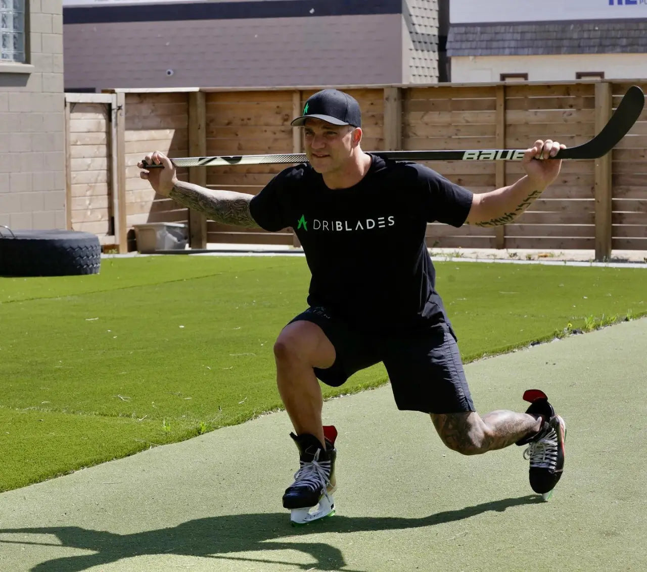 The goal of Hockey specific training is to gain strength and power by training the same muscles that you will use on the ice rink and in hockey games. When you are doing squats, lunges and other leg strengthening exercises, DriBlades™ now allows you to replicate the unstable surface that the skate blade provides and gives you the competitive advantage of building power that can carry over to the ice.